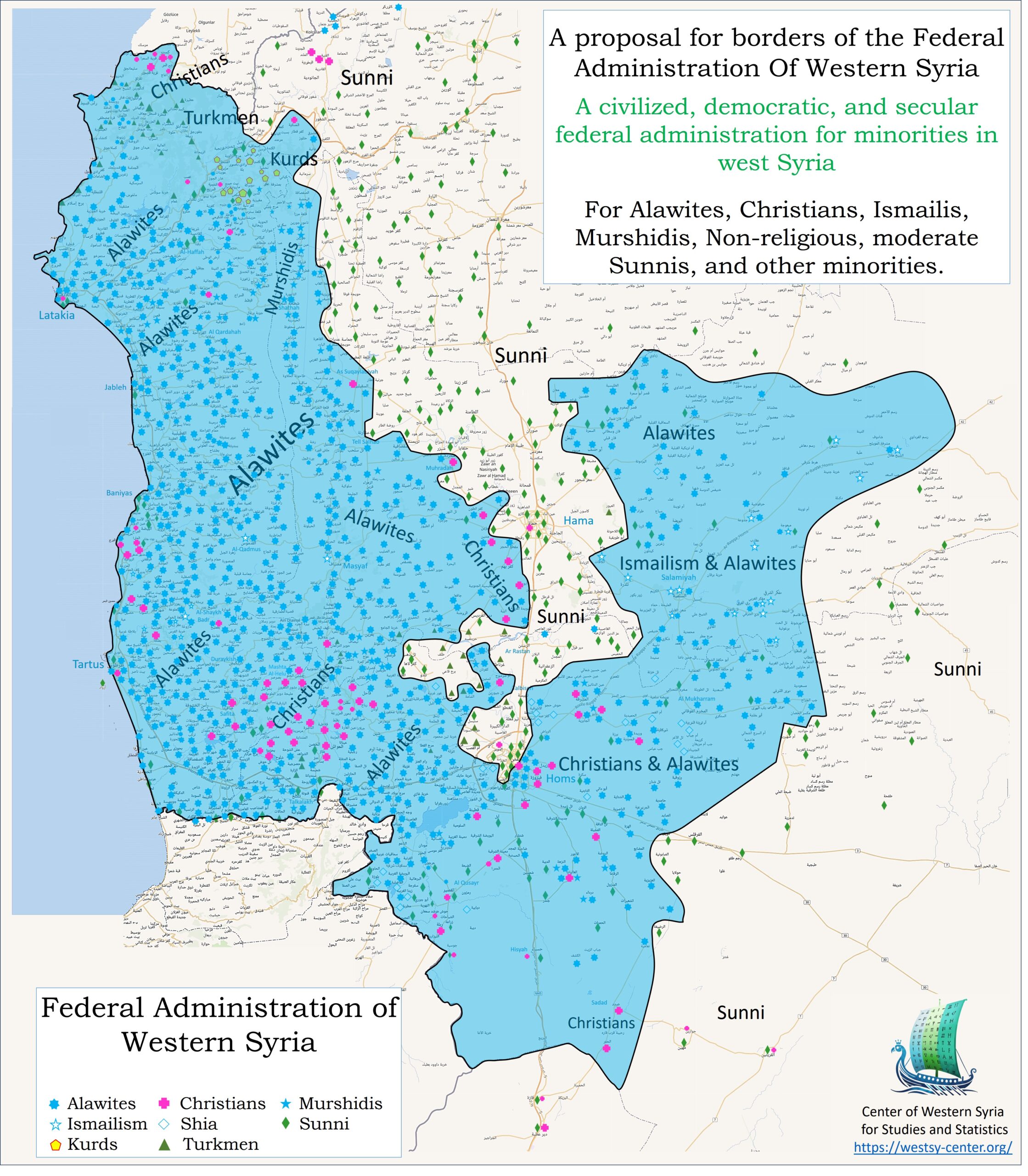 تظهر الخريطة التالية مقترحا عمليا واقعيا لحدود اقليم جغرافي لإقامة إدارة لامركزية او فيدرالية مدنية ديمقراطية علمانية للأقليات في وسط وغرب سوريا: