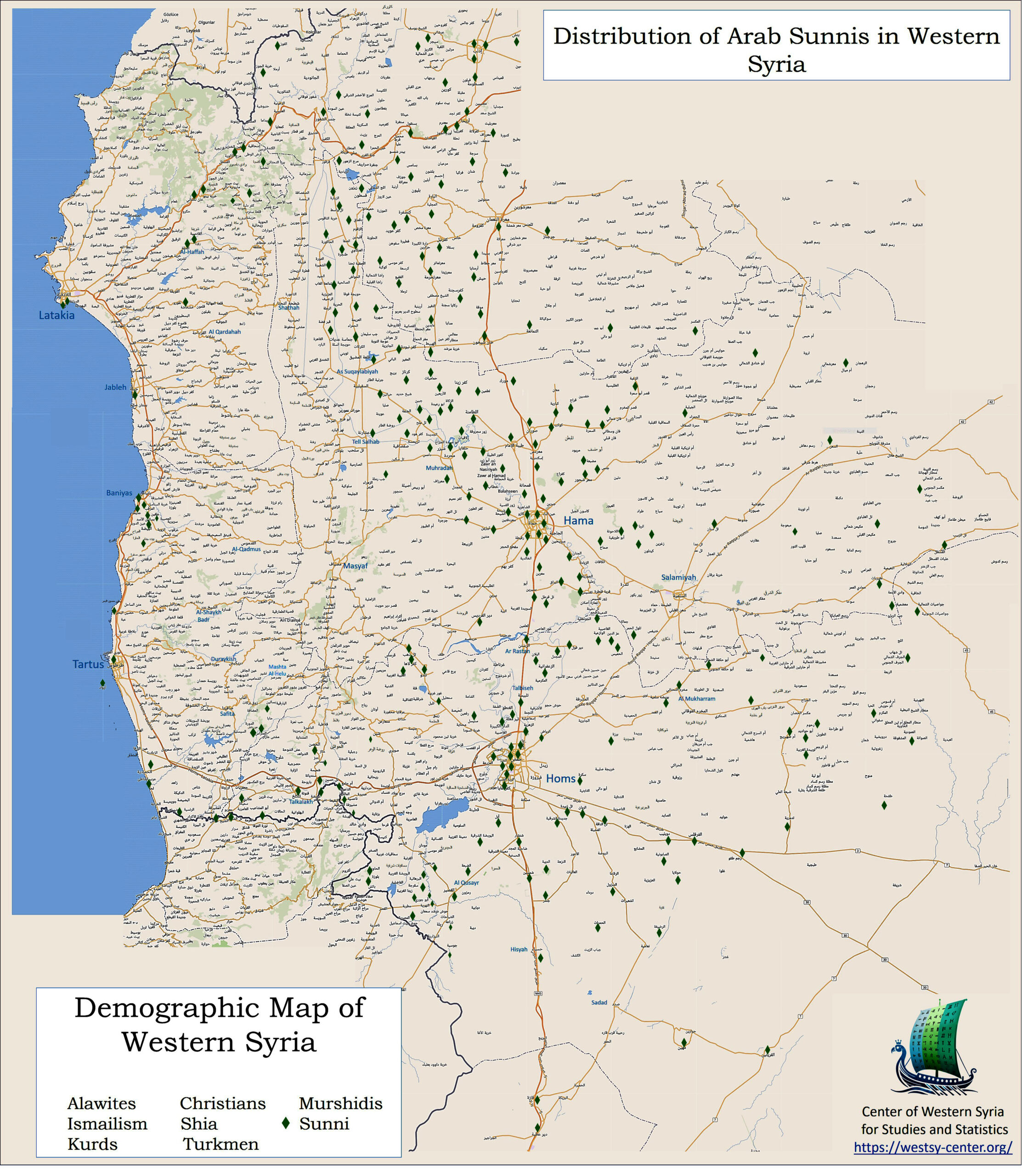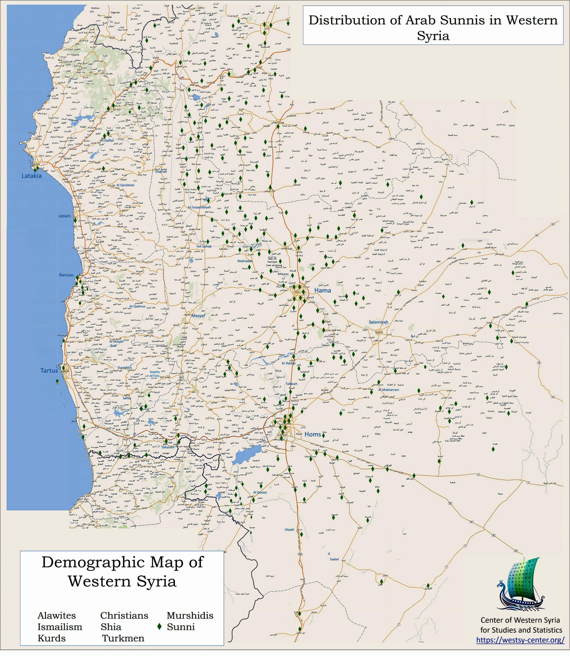 يشكل العرب السنّة الكتلة الأكبر في المناطق الداخلية في سوريا في دمشق، حلب، ادلب، دير الزور والرقة، ودرعا، وهي مناطق خارج نطاق هذه الدراسة. أما فيما يتعلق بوسط وغرب سوريا فهم ينتشرون في المناطق التالية: