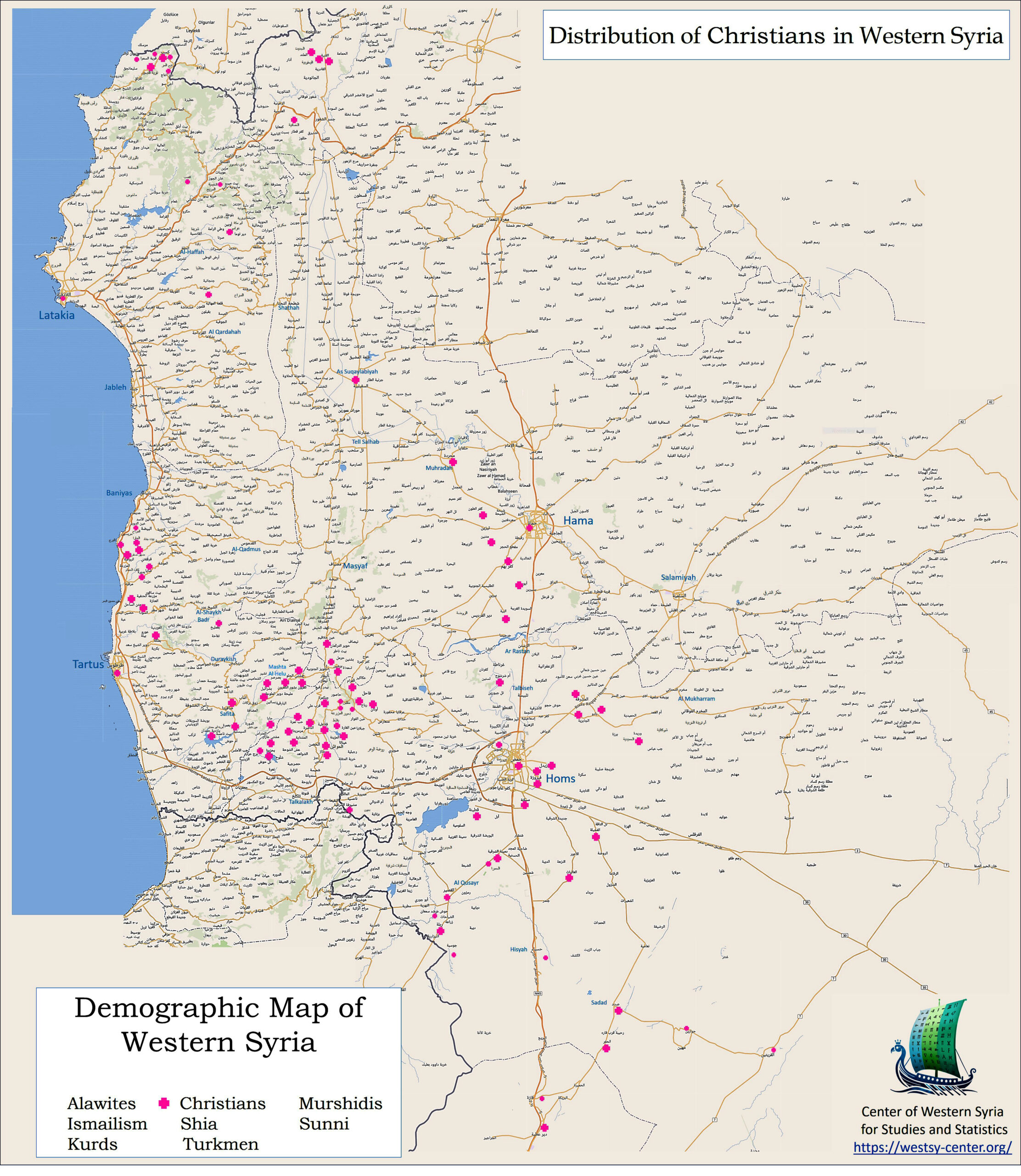 كما يتواجد المسيحيّون بكثافة في الريف الغربي لحمص، لا سيما في قرى جبل الحلو مثل رباح وكفرّام، ومنطقة وادي النصارى من الحواش شرقاً حتى مشتى عازار وحب نمرة على حدود محافظة طرطوس.